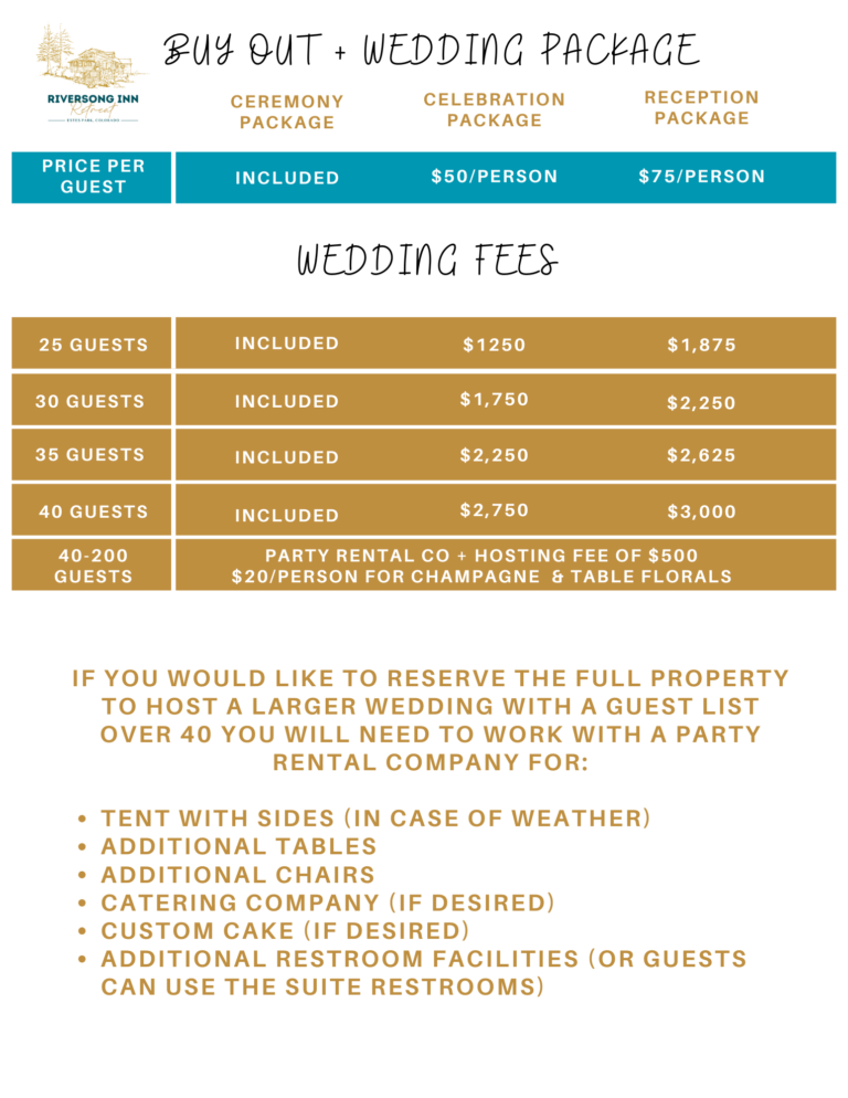 If you would like to do a buy out of the property AND host your wedding at Riversong then you can select your options online: